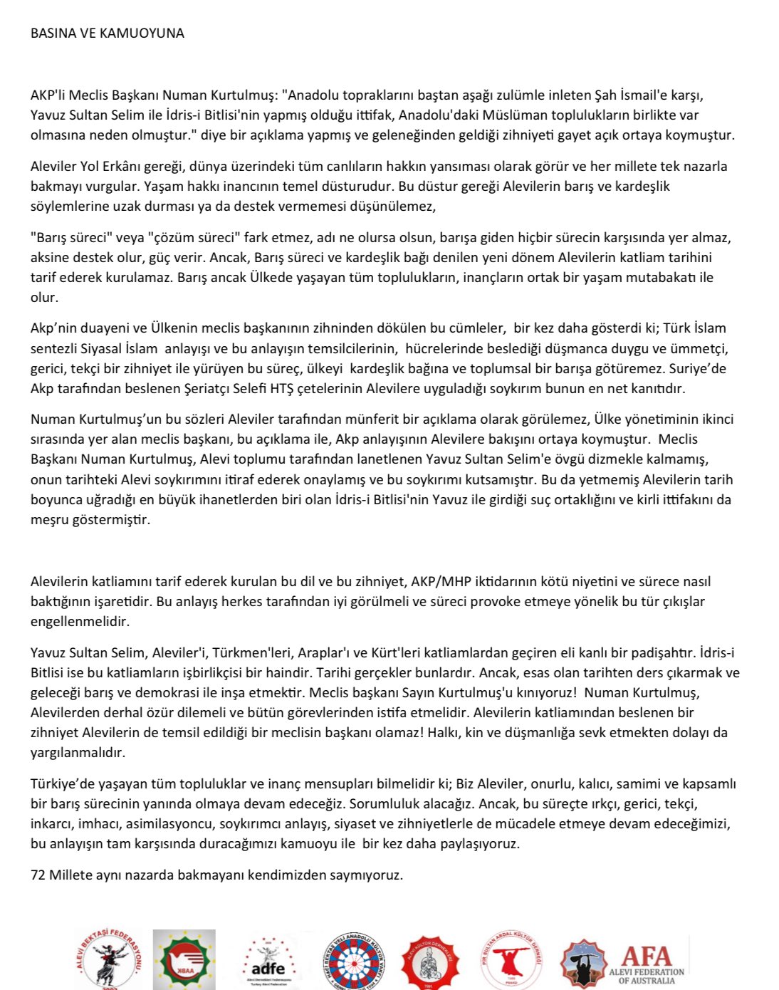 Kurtulmuş’un sözlerinin “Alevi soykırımını onaylamak” manasına geldiği belirtilen açıklamada, Meclis Başkanı’nın Alevilerden özür dilemesi ve tüm misyonlarından istifa etmesi daveti yapıldı.