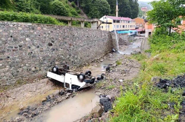 Trabzon'un Şalpazarı ilçesinde yağmur sonrası kayganlaşan yolda direksiyon hakimiyetini kaybeden kamyonet dereye uçtu. Olayda...