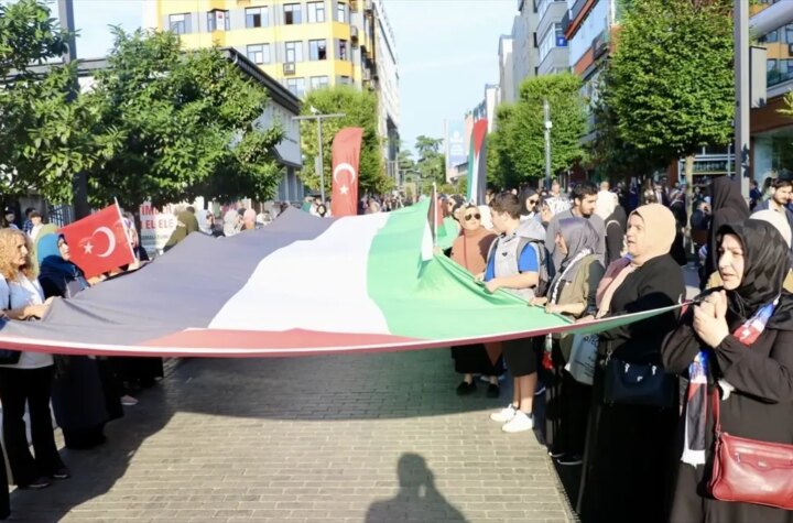 Özgür Aksa Trabzon Platformu üyeleri, Filistin'e dayanak olmak maksadıyla düzenledikleri yürüyüşte, Türk ve Filistin...