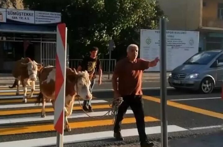 Gümüşhane'nin Tekke beldesinde yaşayan Nurettin Aydoğdu, büyükbaş hayvanlarını karayolundaki yaya geçidinden karşıya geçirerek dikkat...