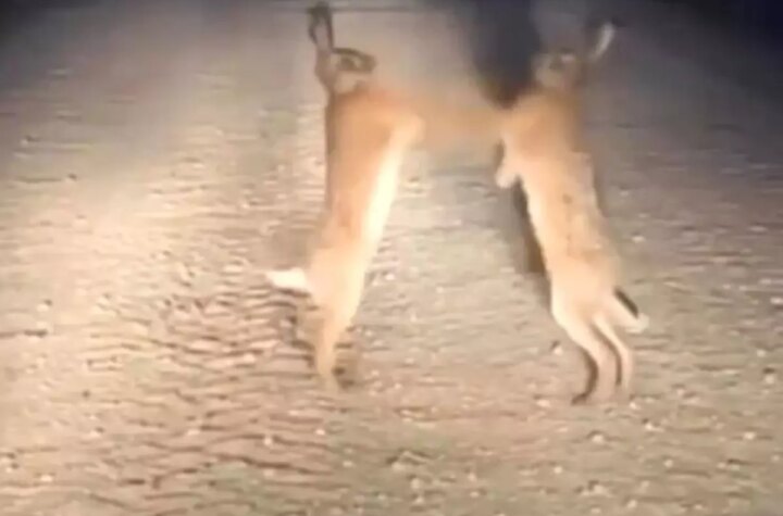 Bayburt'un Aydıntepe ilçesinde iki yaban tavşanının yol ortasında arbede ettiği anlar, bir şoför tarafından...