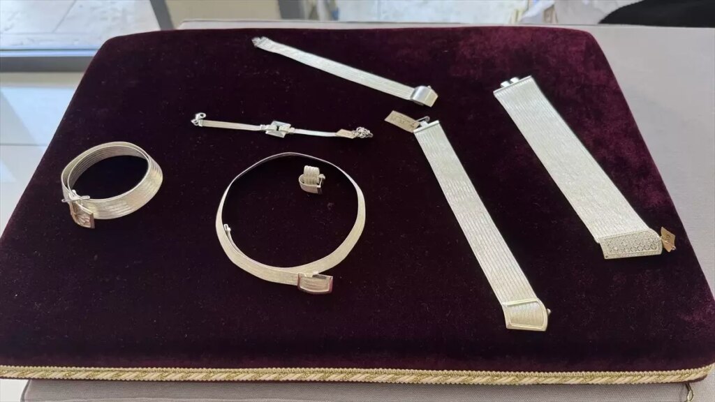 “Diğer arkadaşlarımız da hasır ve telkariyi tanıtıyor. Kazaziyenin tarihi çok eski, Osmanlı tarihine dayanıyor. Birçok tekniğimiz var. Zincir teknikler, sürgü ve top tekniği var. Bunları ördükten sonra ütüleme ve düzleştirme tekniğimiz var. Dizaynda da en son haline dönüştürüyoruz.”