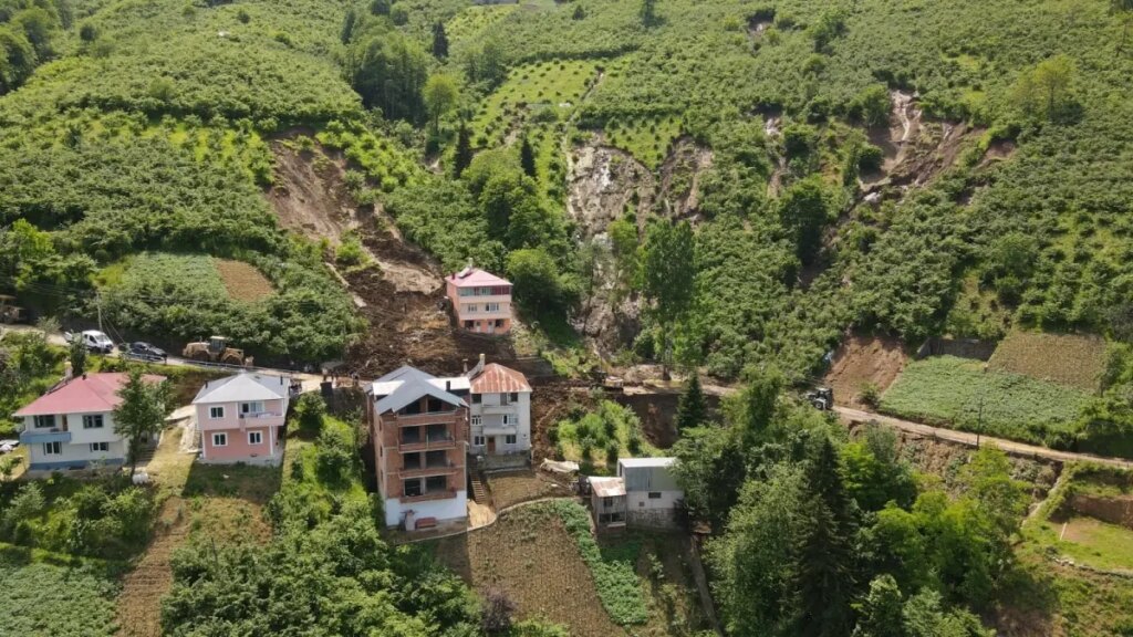 Trabzon'un Ağıllı Mahallesi'nde meydana gelen heyelan, ağır yağışların akabinde üç konutun hasar görmesine yol açtı. Takımlar bölgedeki yolu yine ulaşıma açmak için çalışmalarını sürdürüyor.