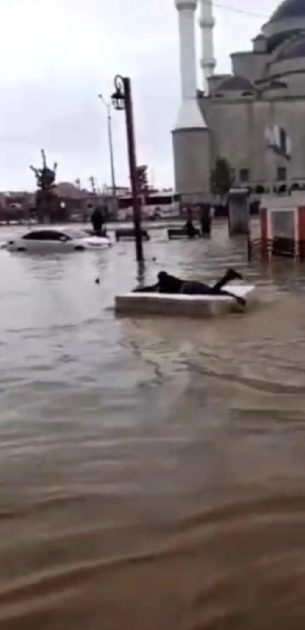 Trabzon’da şiddetli yağış, kent genelinde hayatı olumsuz etkiledi. Yağış nedeniyle birçok noktada yollar ve caddeler göle döndü, ulaşım zahmetle sağlandı. Ortahisar ilçesi Pazarkapı Mahallesi de selden en fazla etkilenen noktalardan biri olurken, bir vatandaşın mahalledeki bir mobilya dükkanından aldığı yatağını suyun üzerine bırakarak adeta “sal” üzere kullanması görenleri güldürdü.